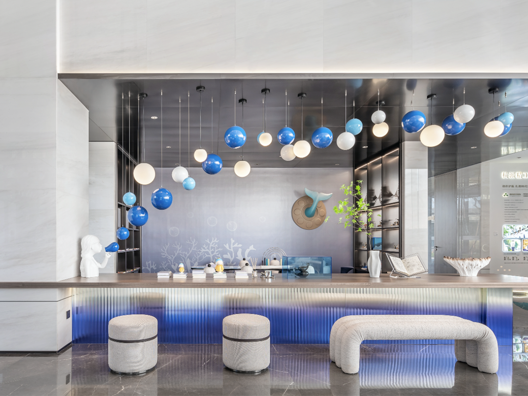 “海上絲綢之路”為靈感來源的設(shè)計(jì)巧思,貫穿在各個角落:水滴造型的沙盤吊燈、融合海豚與白鷺意象的雕塑、懸浮空中的藍(lán)白色泡泡……