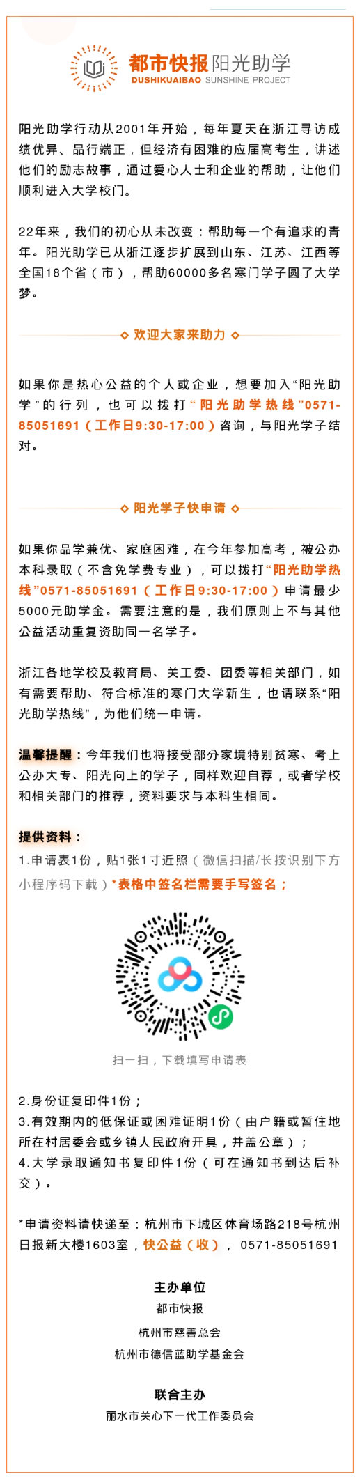 如果您也想幫助寒門學(xué)子圓大學(xué)夢(mèng),或者您身邊有希望圓夢(mèng)的寒門學(xué)子,都可以撥打都市快報(bào)陽(yáng)光助學(xué)熱線0571-85051691(工作日9:30-17:00)咨詢,謝謝你們對(duì)陽(yáng)光學(xué)子的支持和鼓勵(lì)。您也可以關(guān)注“快公益”微博、微信,獲取更多助學(xué)信息。
