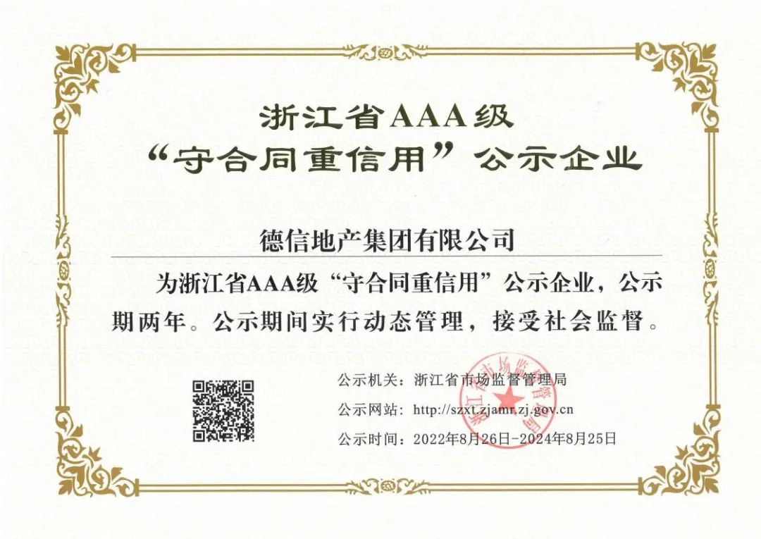 近日,2022 年浙江省 AAA 級“守合同重信用”企業(yè)評定結(jié)果新鮮出爐,經(jīng)企業(yè)申報、各級審核、省局辦公會議研究,9001cc金沙以诚为本地產(chǎn)集團有限公司入選2022 年浙江省 AAA 級 “守合同重信用”企業(yè)。榮譽是激勵,更是責任和鞭策。未來,9001cc金沙以诚为本地產(chǎn)將繼續(xù)強化“契約”精神,誠信經(jīng)營,為促進社會誠信體系建設,創(chuàng)造良好的市場經(jīng)濟秩序,推進浙江省經(jīng)濟高質(zhì)量發(fā)展作出新貢獻。