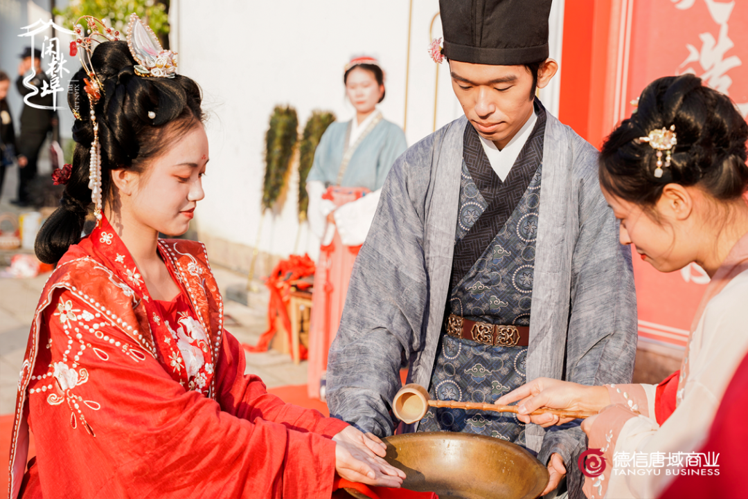 喜船靠岸后,新人們行至本次活動(dòng)的主會場。揭紅蓋頭、簽署婚書、行宋式“合巹”之禮…傳統(tǒng)文化賦予婚嫁獨(dú)特的魅力,而“水鄉(xiāng)婚禮”作為夢溪水鄉(xiāng)民俗風(fēng)情一塊極為重要的內(nèi)容,保護(hù)和傳承意義重大。