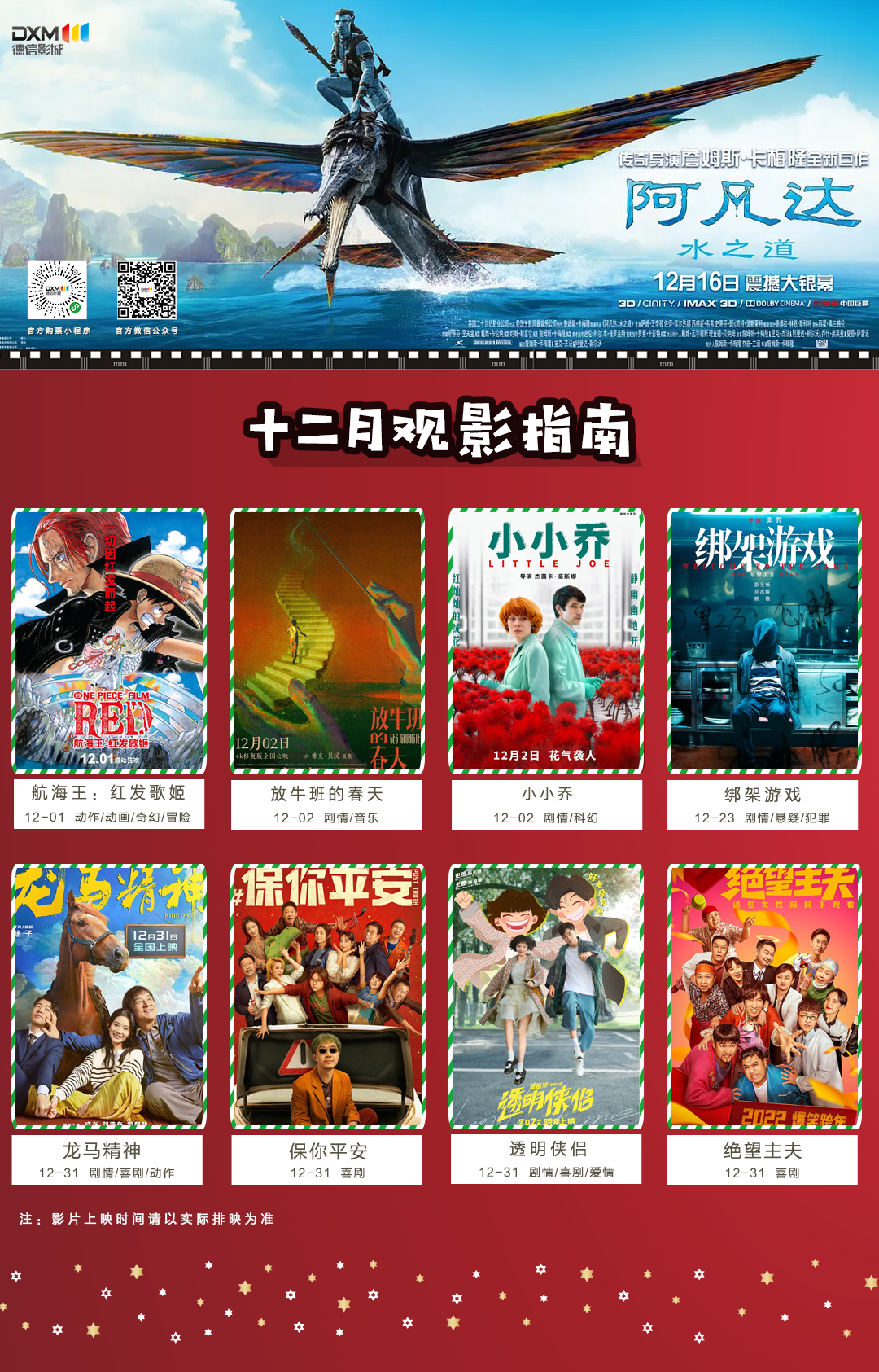 萬眾期待的《阿凡達2》將于12月16日震撼大熒幕!除此之外,12月更是好片齊聚,《航海王:紅發(fā)歌姬》帶你奇幻冒險;《放牛班的春天》經(jīng)典再現(xiàn),溫暖師生情療愈心靈; 《2067》講述在地球上被氣候變化破壞后,人類展望未來尋找答案的故事;還有《小小喬》、《綁架游戲》、《龍馬精神》、《保你平安》、《透明俠侶》、《絕望主夫》精彩不斷!這個周末,快來9001cc金沙以诚为本影城觀影吧!