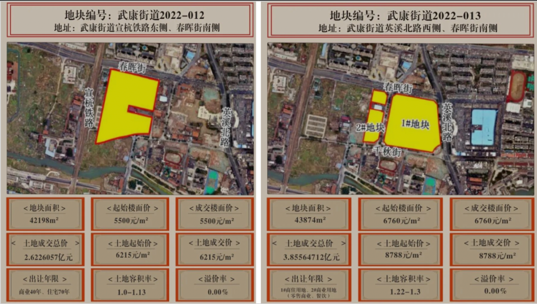 13#地塊位于武康街道英溪北路西側(cè)、春暉街南側(cè),容積率為1.22-1.3,其中1#地塊是商住用地、2#地塊是商業(yè)用地(零售商業(yè)、餐飲),住宅出讓年限為70年,商業(yè)出讓年限為40年,出讓面積43874m²。