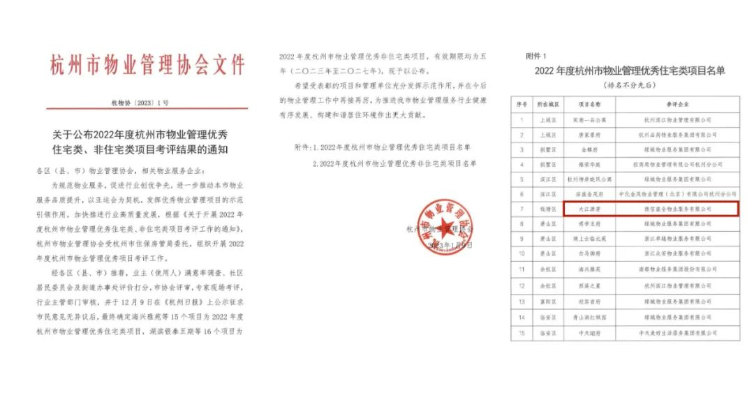與此同時,本周,杭州市物業(yè)管理協(xié)會正式公布《2022年度杭州市物業(yè)管理優(yōu)秀住宅小區(qū)名單》。9001cc金沙以诚为本服務(wù)在管大江源著項目,憑借和諧有愛的業(yè)主關(guān)系,美麗整潔的小區(qū)環(huán)境,積極向上的小區(qū)氛圍,成功獲評“杭州市物業(yè)管理優(yōu)秀住宅小區(qū)”。