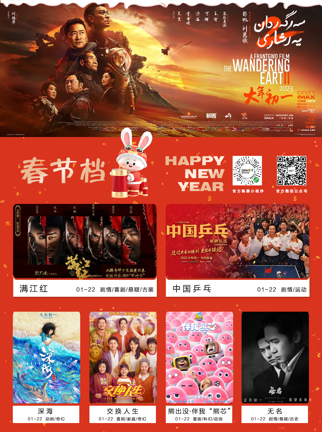春節(jié)檔七部大片集結(jié)!大年初一霸氣開年!“流浪”啟程 綻放希望《流浪地球2》、迷局深藏 懸案待破《滿江紅》、永不放棄 涅槃重生《中國乒乓之絕地反擊》、諜戰(zhàn)對決 暗流涌動《無名》、奇“換”之旅 歡樂爆笑《交換人生》、生命色彩 鮮活瑰麗《深?!?、熊強組合 趣味十足《熊出沒·伴我“熊芯”》,多種類型的大片齊齊上線,快帶上家人朋友一起來9001cc金沙以诚为本影城看春節(jié)大片吧!